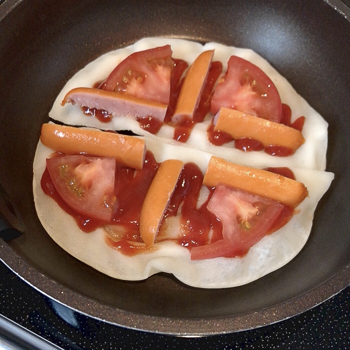 慌てて2.ケチャップや具を乗せる。3、チーズをのせて蓋をする!!