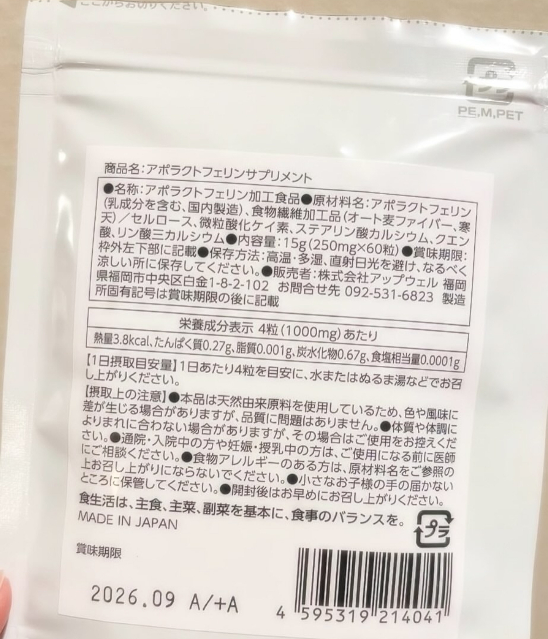 「アポラクトフェリンサプリメント(約15日分)」を試してみました。このサプリメントにはアポラクトフェリン※1が配合されており、日々の健康管理を意識している方におすすめです。