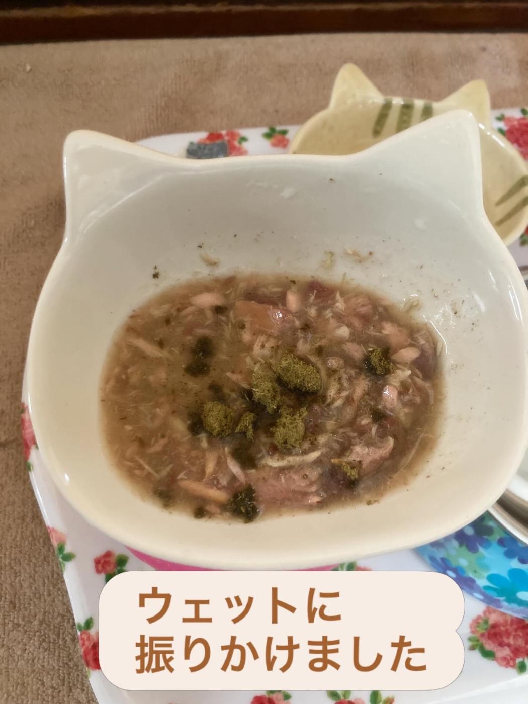 今回はいつものフードに細かく砕いてトッピング。フリーズドライなので手で簡単にほぐせるのがとても便利です。驚いたのはその「食いつき」!普段は新しいものに警戒しがちな1匹も、一口食べたらお皿がピカピカになるまで夢中で完食してくれました。😋