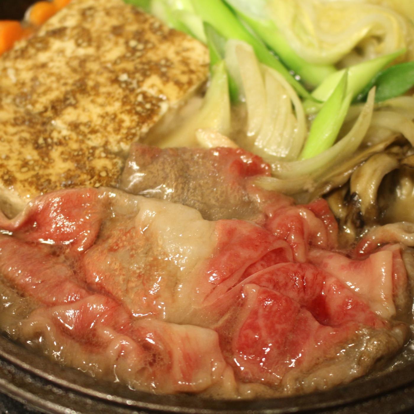 焼き豆腐、新玉ねぎ、白菜、ねぎ、舞茸、人参と宮崎牛特選肩ロース!
