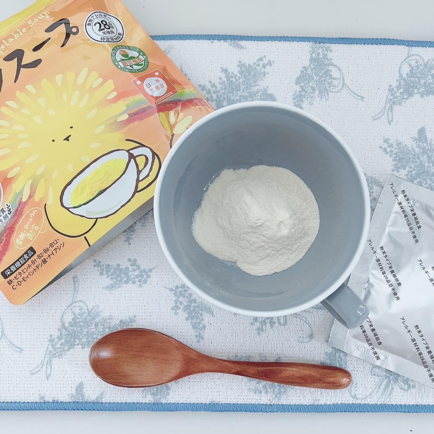 湯(or 水でもOK!)を注いで 10秒混ぜるだけで完成する粉末スープなんだけど、 野菜コンソメ味で美味し...