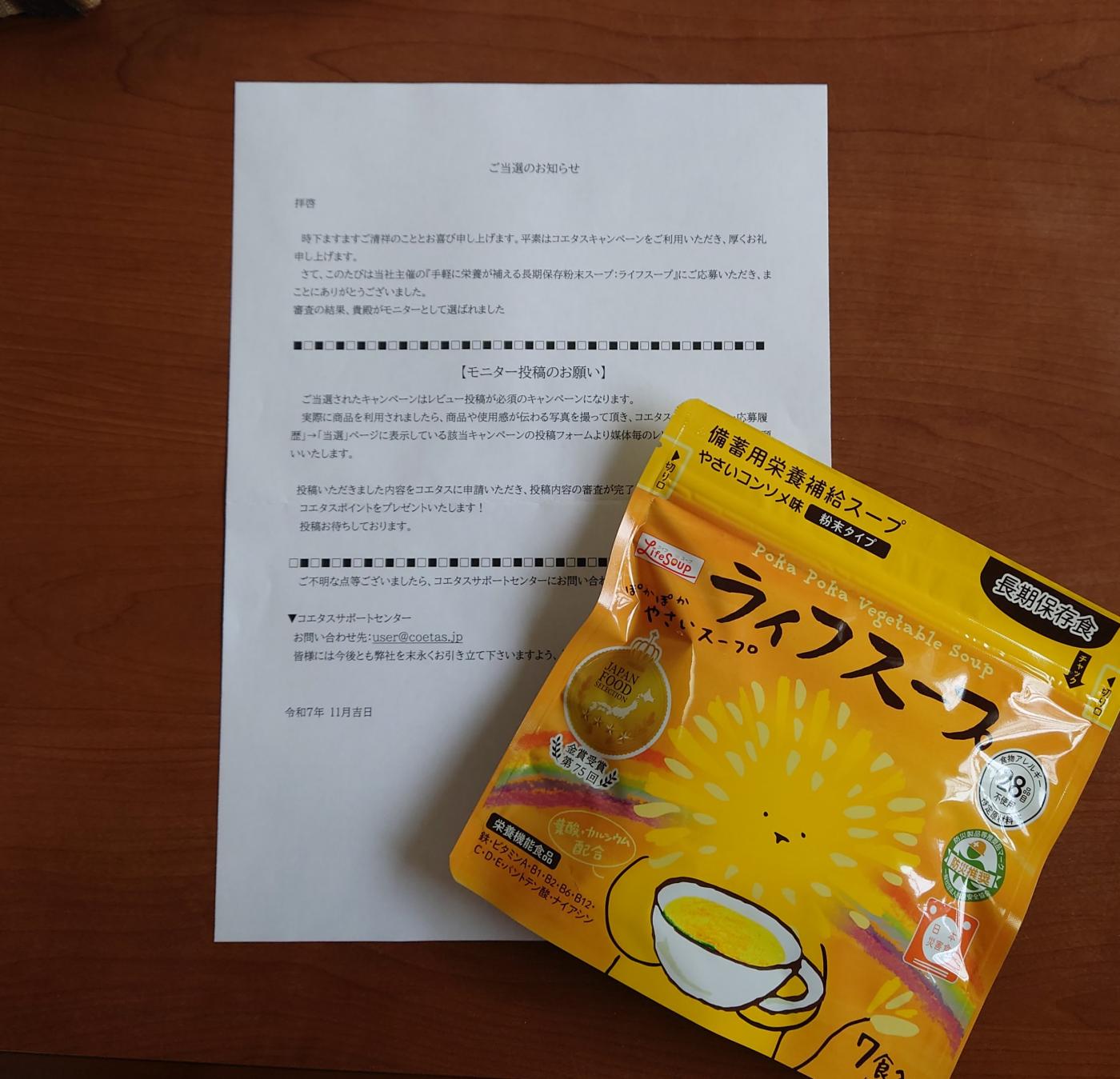 コエタスのモニターキャンペーンでいただいた【手軽に栄養が補える長期保存粉末スープ】ライフスープに...
