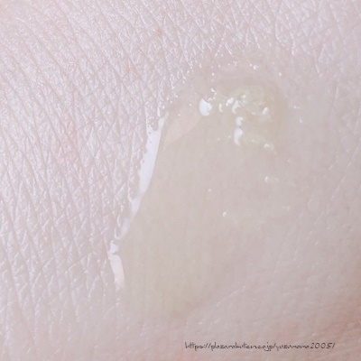 タマヌオイルは20℃以下で少しずつ白く固まる性質があるので、少しドロッとした印象。室温の低い朝に見てみたらもっと固まっていました。これは高品質なオイルの証拠なんだそうです。でも手に取ってみるとすぐ体温で溶けます。少しつぶつぶしたものが見えますが硬さは無く、指でクルクルと馴染ませると溶け込んでしまうので異物感はありません。