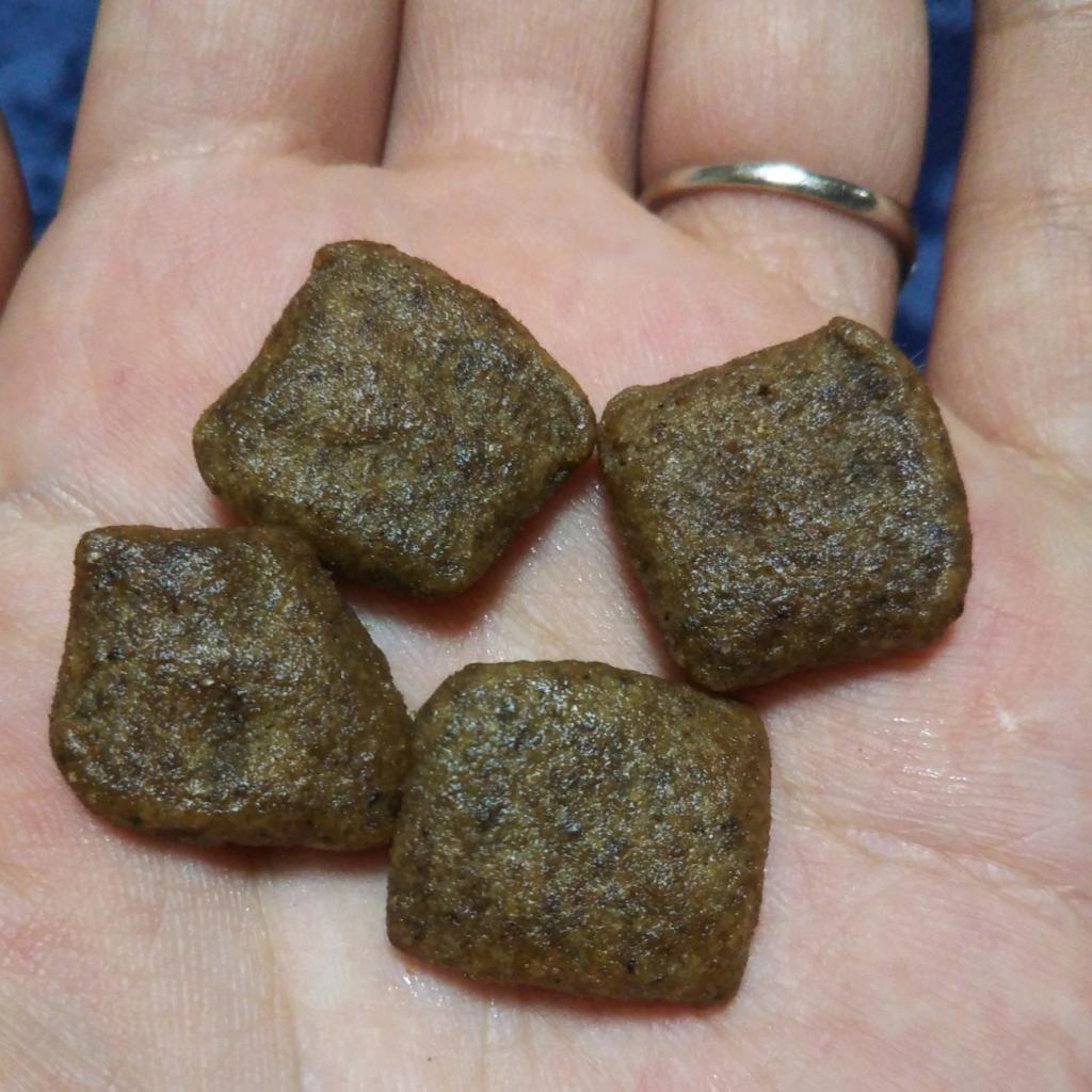 お試しサイズは1袋90g。爽やかな水色パッケージデザインもおしゃれです!大き目カットのドッグフードで固めな感じです。あまり大きめサイズはあげたことがないけど、ボリボリ、カリカリとしっかりと良く噛んでくれて、あっという間に完食してくれました。食べっぷりがいいです!!ここ最近食べ残しが多くて気になってたんだけど残すことなく食べてくれて安心です。においも他と変わりないし、おやつにも見えるからか警戒心もなしでした。昆虫って聞くとえっ?って驚くけどタンパク質、ビタミン、ミネラル、食物繊維などの栄養をたっぷりと含んでいて良質なドッグフードの原料になるそうです。牛肉の2倍以上のタンパク質を含む(GREEN PETFOOD社調べ)うえ、飼育時に抗生剤やホルモン剤を使用していません。肉類などのアレルゲンとなる成分をカットし、低刺激性のタンパク質を使用することで、愛犬の健康を守ってくれます。体に優しい5つの無添加で安心、安全だしスーパーフードも配合されてるし、愛犬の健康が一番なのでこだわりの詰まったドッグフードだということが良くわかる商品です。我が家の愛犬は8月で11歳になるのでドッグフードにはこだわってあげたい!!って思ってたのでピッタリな商品に出会えました♪お試しセット90g4袋が¥980から購入できるので気になる方にはすごくおススメ商品です。