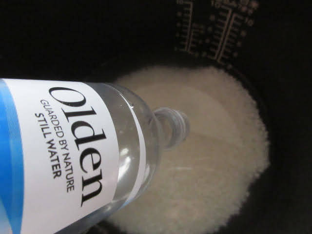 水研ぎした約3合のお米にOldenを加えます。普段3合炊きをする際はお水の量を2.5の目盛に合わせて強炊きにしておりますので、1本丸々使用することで上手く調整することができますね。