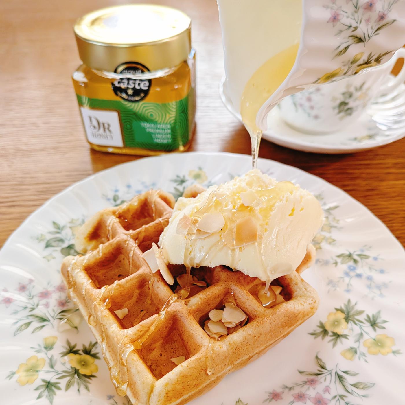 今回はワッフルにバニラアイスとアーモンドスライスをトッピングし、仕上げにたっぷり蜂蜜をかけて楽しんだよ