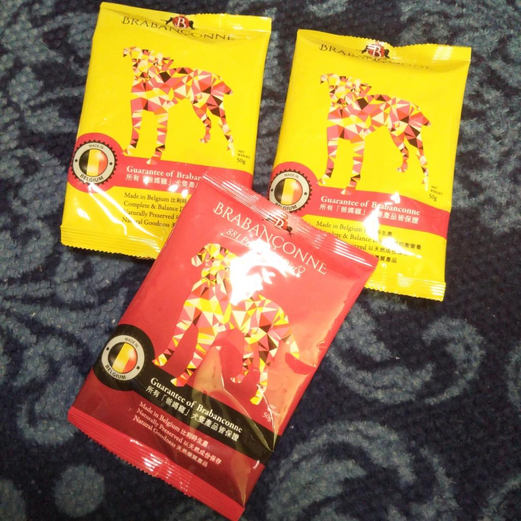 ベルギー産まれのペットフードブランドBRABANCONNE(ブラバンソンヌ)!初めて知りました!黄色と赤色の袋入りで犬のデザインもおしゃれで可愛いデザインです。天然素材にこだわり、ヒューマングレードのお肉や新鮮なお魚など、厳選されたヨーロッパ産の最高品質の食材を使用しており、年齢や品種、体質などさまざまなニーズに合わせて必要な栄養素をバランスよく配合した理想的なペットフードだそうです。我が家の愛犬はトイプードルで11歳の男の子♪特に病気などの悩みはないけど高齢だし、ご飯はこだわってあげたい!!うちの子ここ最近、なぜかご飯食べてくれない日が続いてて食べ残しも多い。でも体重減るわけでもなく、ご飯に飽きちゃった?的な感じです。そんな時にブラバンソンヌをあげてみました。小型成犬用グレインフリー-チキン50g 、小型成犬用グレインフリー-フィッシュ50g 、犬用消化器サポート-チキン50gの3種あり、まず小型成犬用グレインフリー-チキン50g を。黄色い袋入りでこげ茶のカリカリの小粒。開封しただけで寄ってきて写真撮るにも愛犬が寄ってクンクンすごい興味津々!待て!も耐えるのに必死!お皿に入れた瞬間から迷いなく食いつきました!食べてるとこ写真撮りたくてもブレブレ!あっという間に完食。昨日まで食べなかったのが嘘のようです。他2種も小粒であっという間に食べちゃいました。うちの子はチキンがお気に入りみたい!食いつきがこんなにもいいご飯はめずらしく、愛犬にあってるというか好み見たいです。現品購入候補です。初めての方でも安心の初回限定でお試し50g3種¥300で購入できるのでおススメです。我が家の愛犬は驚くほどの食いつきの良さを実感できました♪