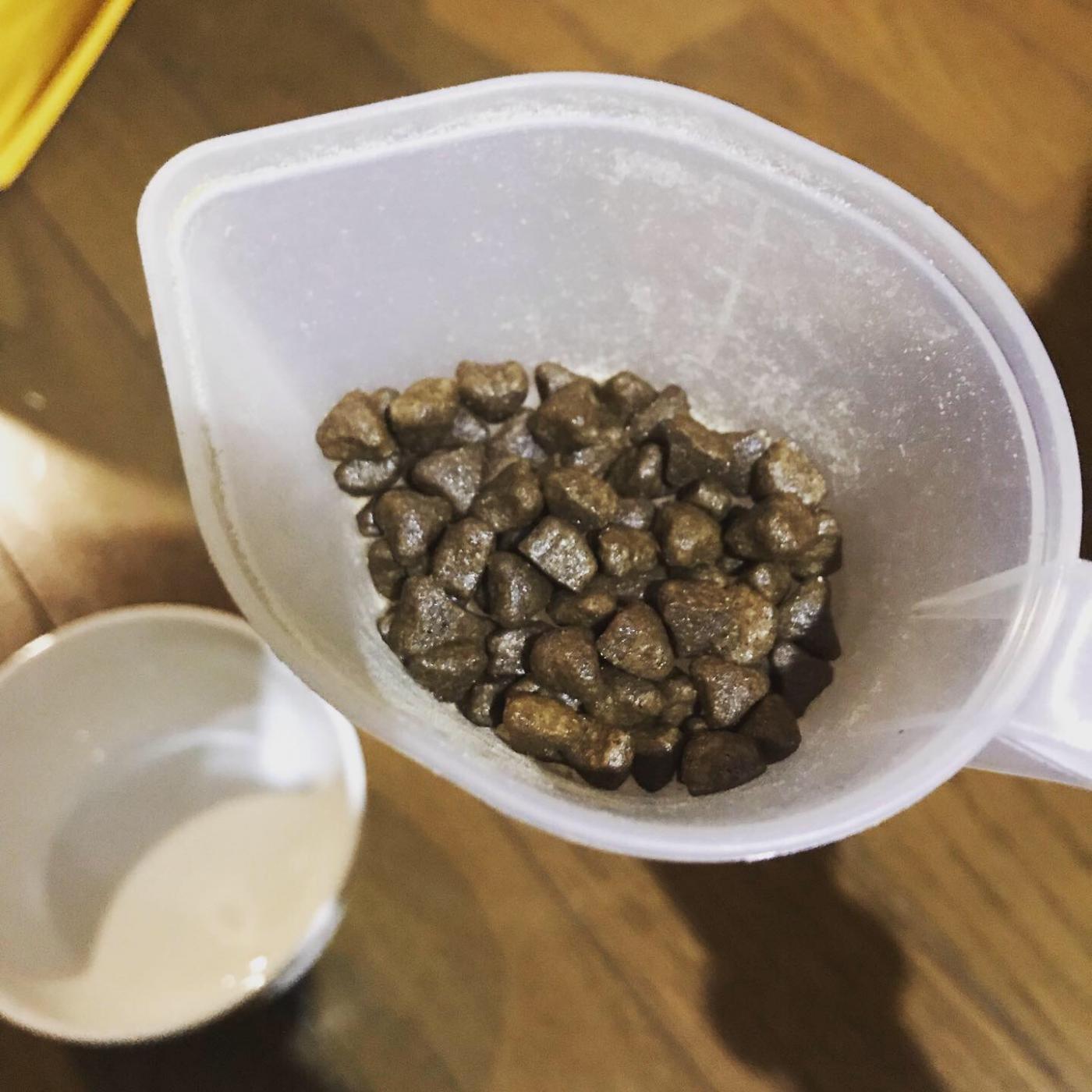 残念な事に我が家には測りがなくパッケージにはグラム数でしか給与目安が書いていなかったのでカップ数で教えて欲しいとお聞きした所、カップの種類が分からない…と言われてしまい(普通のカップです笑)ちゅーる2本で30gと教えて頂いたので、与える量が35~40gとして体重減少気味なのでそんな所かなと。
