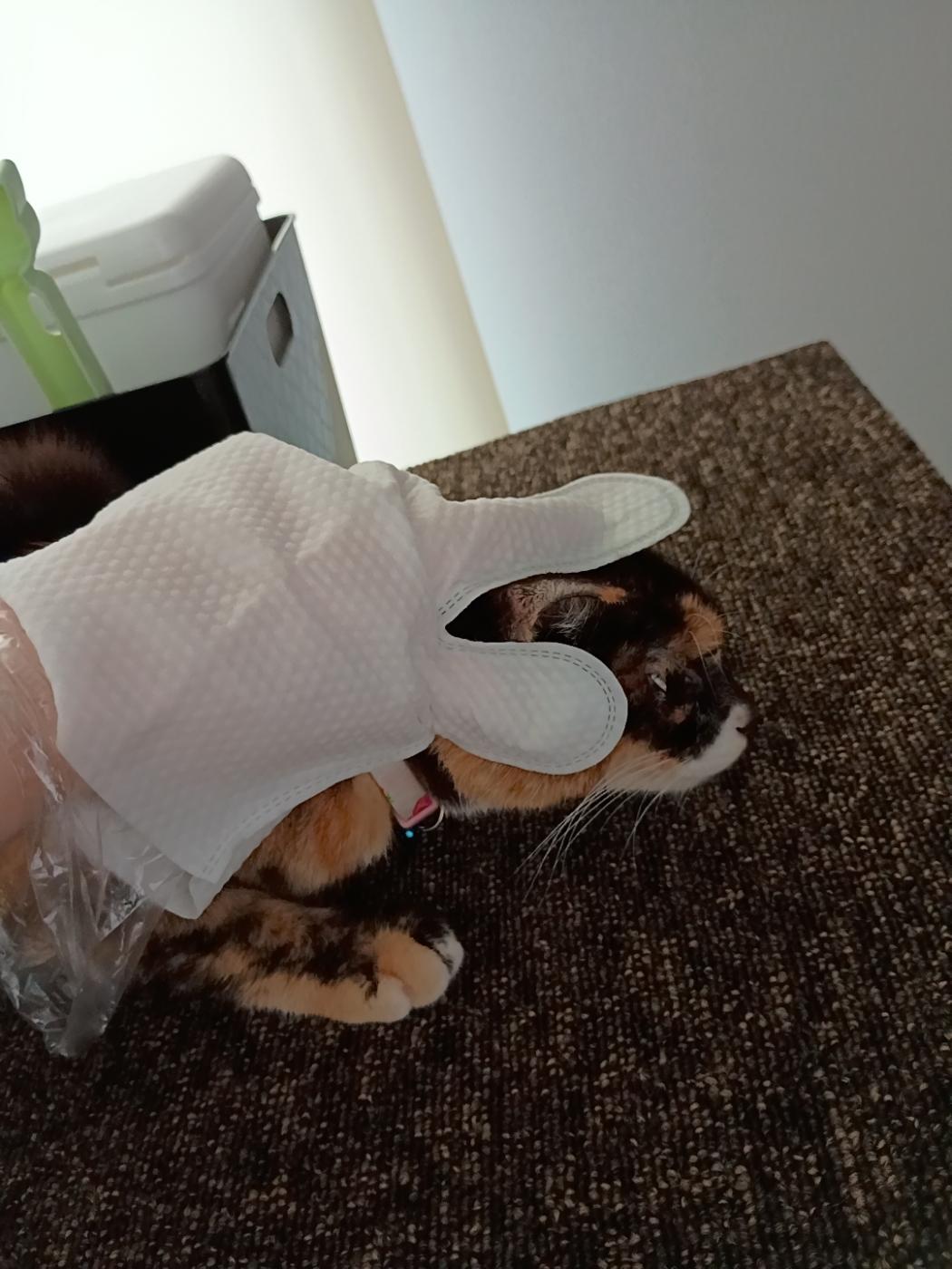 手袋状になっているので、使いやすいです♪ 使用感は人間用のさらっとめフェイスパックみたいな感じか...