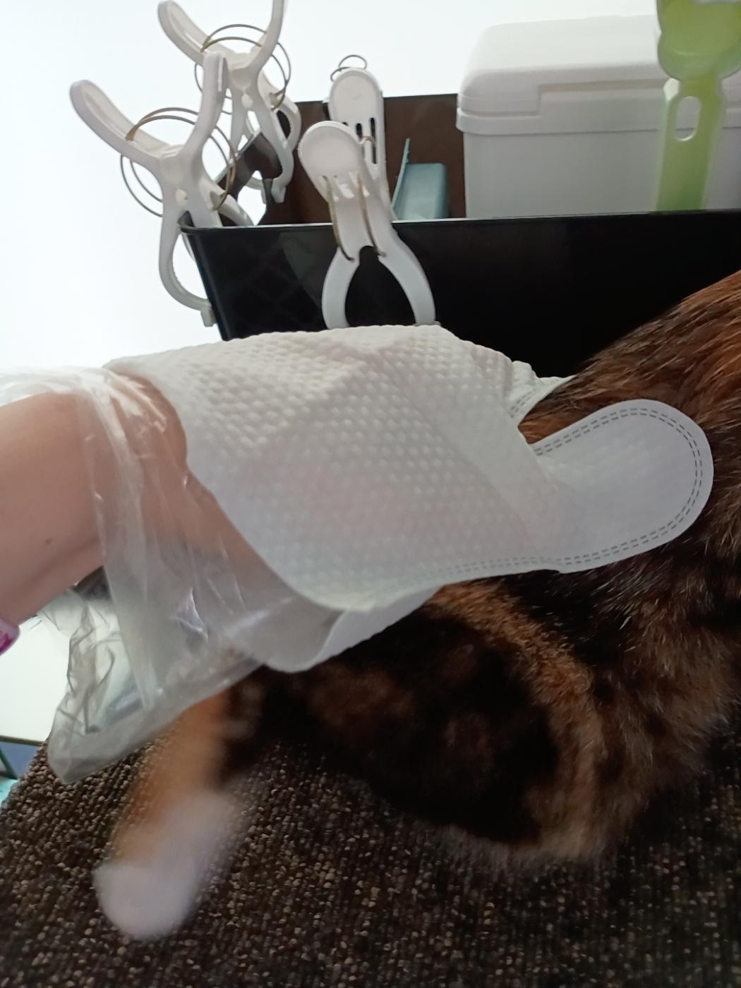 中にビニール手袋をしてから、what the pet ペット用クリーニンググローブを使うと、自分の手もぬれずに使用できます