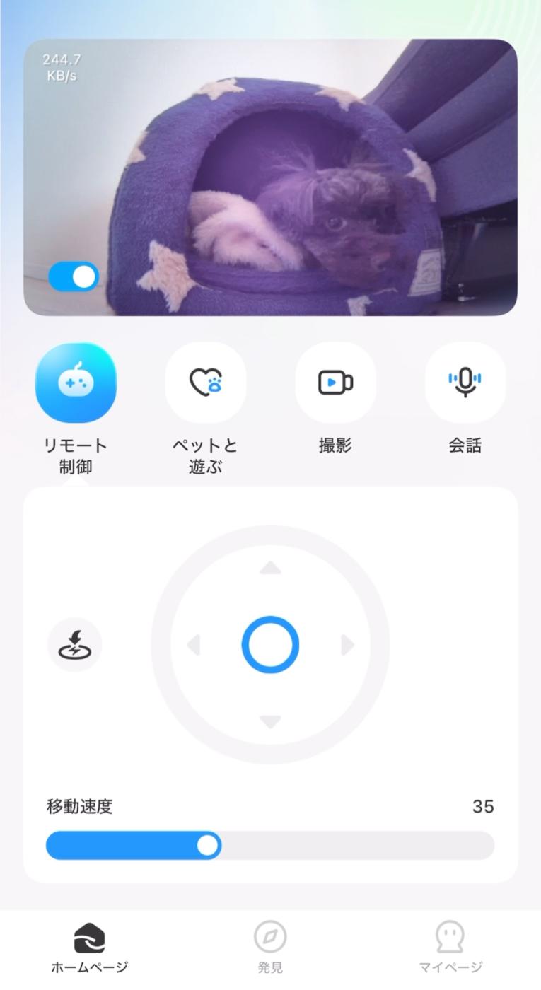 アプリから簡単操作すると自分でお部屋を動き回ってくれて、リアルタイムで映像や音声確認ができるのが魅力的。特に愛犬はよく移動するので、今まで使っていたカメラだと姿が見えなくなることもしばしば……