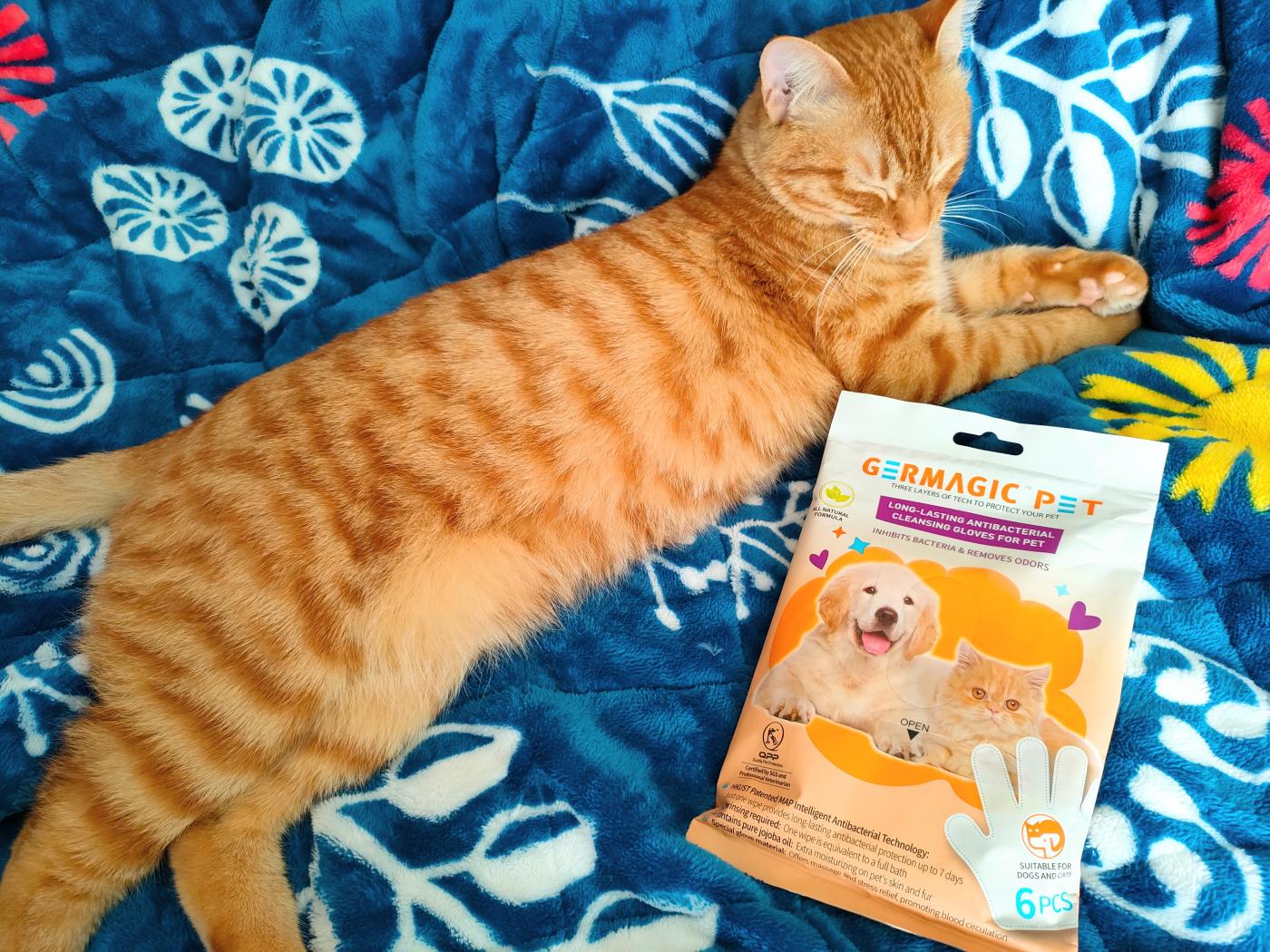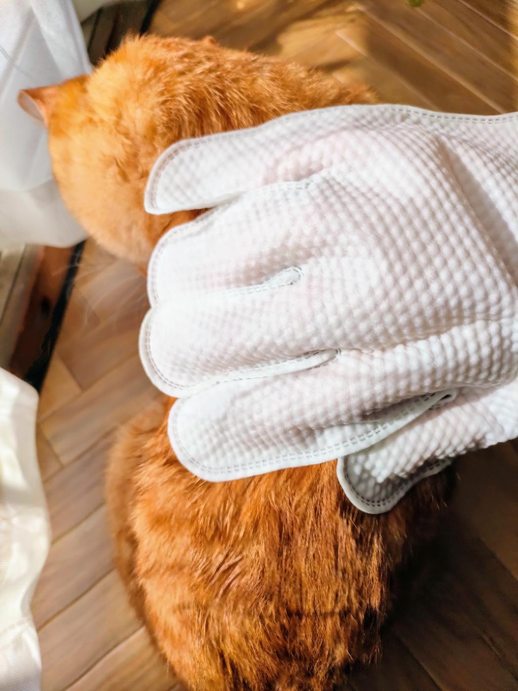 愛猫はシート状のものだと拭かれると勘づいて逃げてしまうことがあるのですが、こちらは手袋型なので違和感が無さそうな様子。