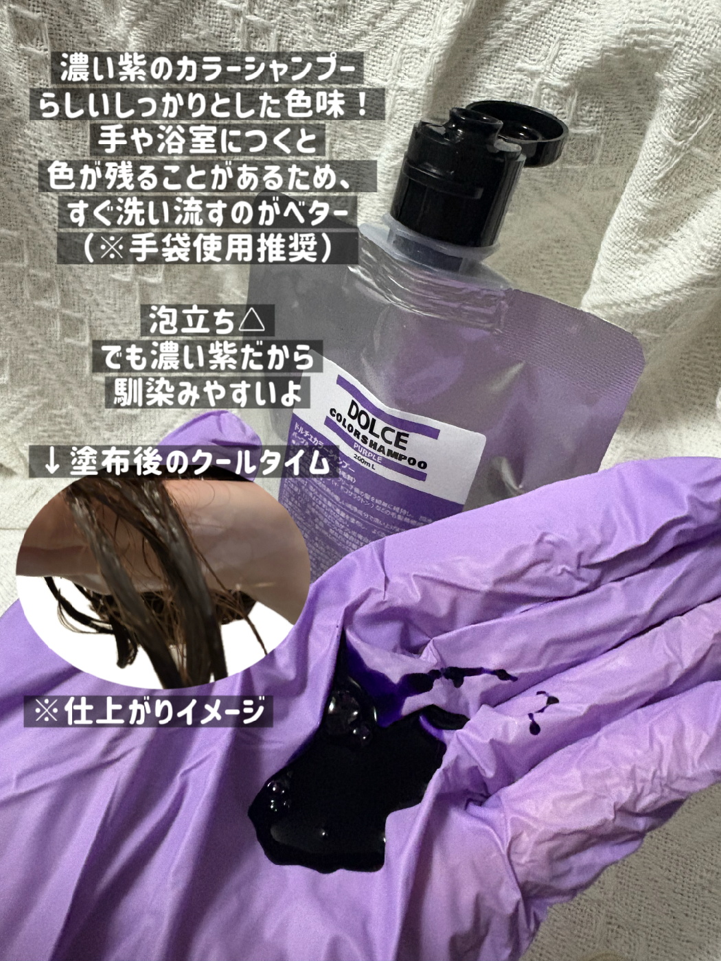 DOLCE カラーシャンプーは、カラーの色持ちをキープしたい方やブリーチ後の黄ばみを抑えたい方におすすめのアイテムだと思いました。カラーをしてから約3週間してから届いたので残念ながらカラーのモチについてはスズメの涙ほどの効果しか感じられませんでしたが。