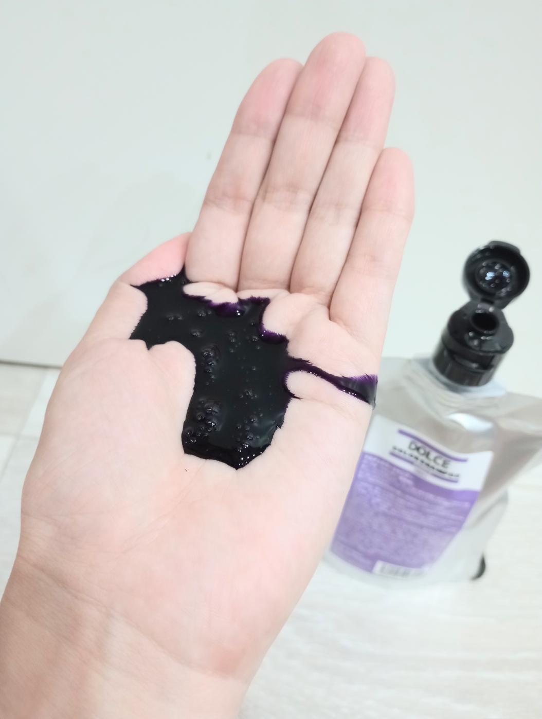 今までムラサキシャンプーはいろいろと使ってきましたが、こんなにもサラッと粘度が低く、染料の色が濃いものは初めて使いました。