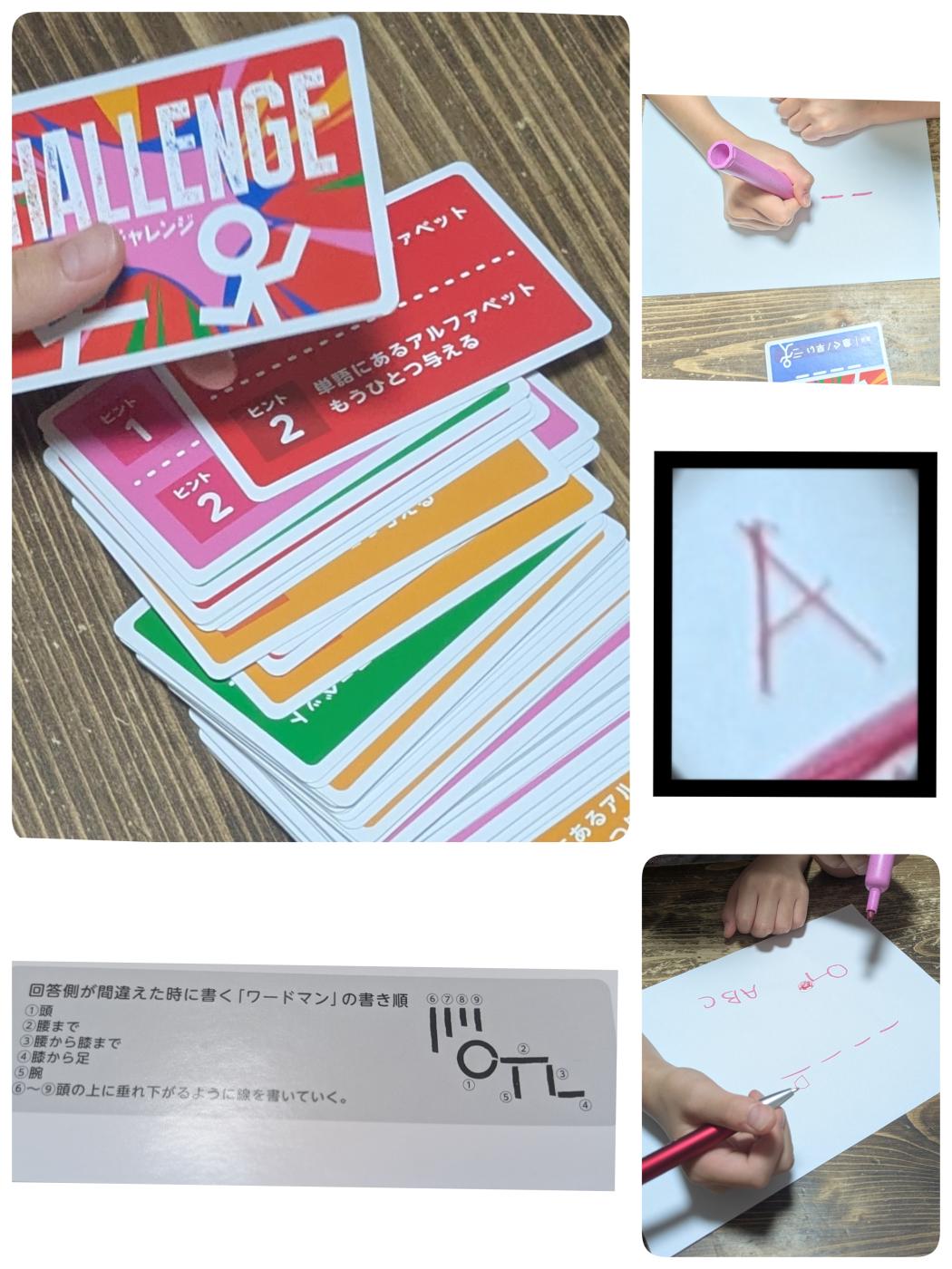 わが家は結局、ワードマンのルール通りではなく、子どもが聞いたことがある英単語、英単語の文字数が少ないカードを選び、時間制限なしで、カードに書かれた意味と絵を見せて、入ると思われるアルファベットを紙に書かせて、完成したら、一緒にカードのアルファベットを冒頭から一つずつ、見せて答え合わせをし、正解文字数が多かった人が勝ち!という遊び方にしたら、興味を持ってやってくれました。