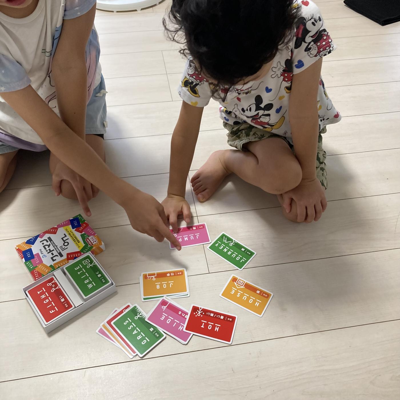 我が家では4歳と7歳の子どもと一緒に遊んでみました。対象年齢より少し下ですが、絵を見ながら「これは何の意味かな?」とクイズ形式で遊んだり、「日本語で○○は英語で××と書くんだね」と言いながら、自然に英語への興味を引き出せました。まだ正規のルールで遊ぶには早いものの、カード自体が英語の入口としてとても優秀。英語に苦手意識を持つ前に“英語=楽しいもの”という印象を植えつけられそうです。