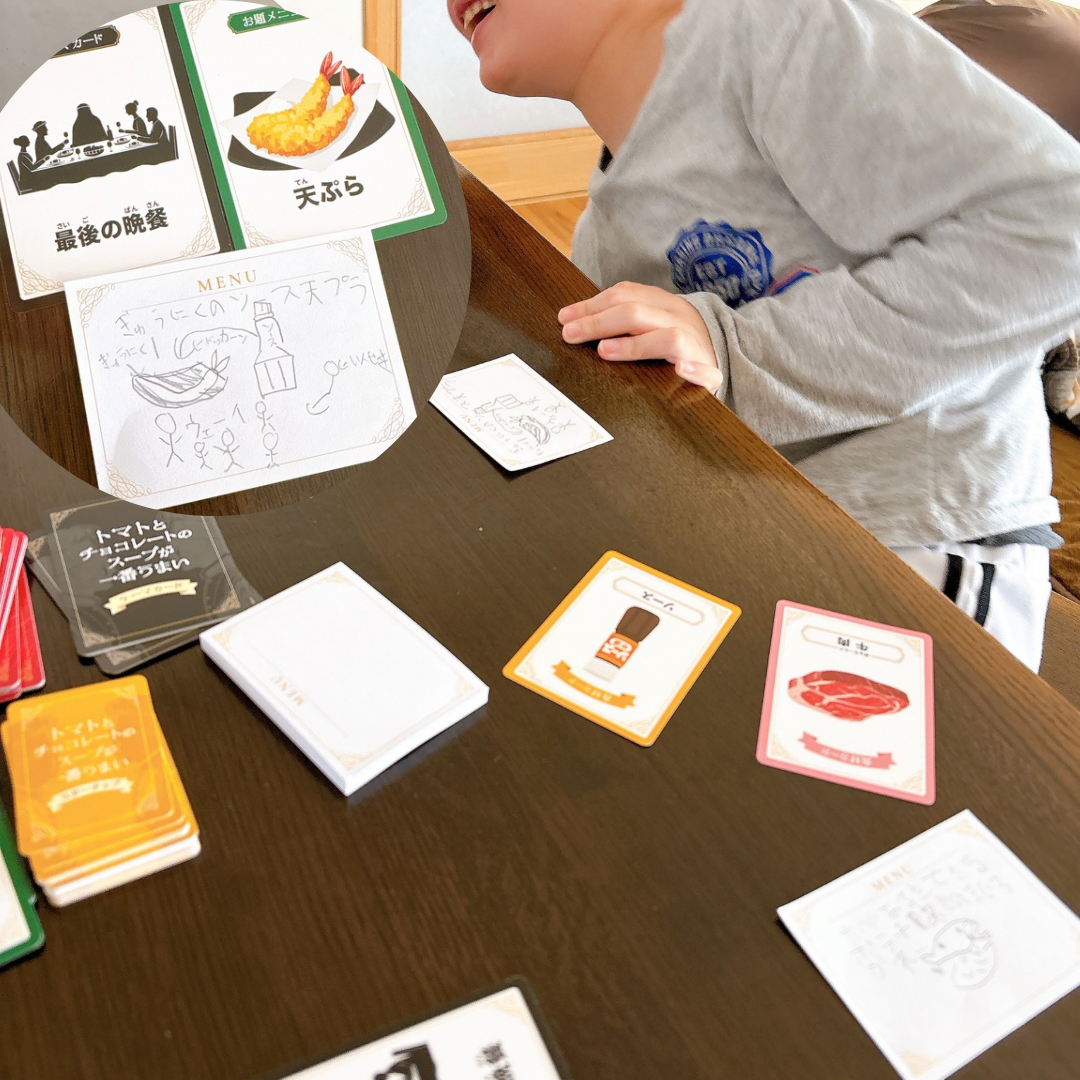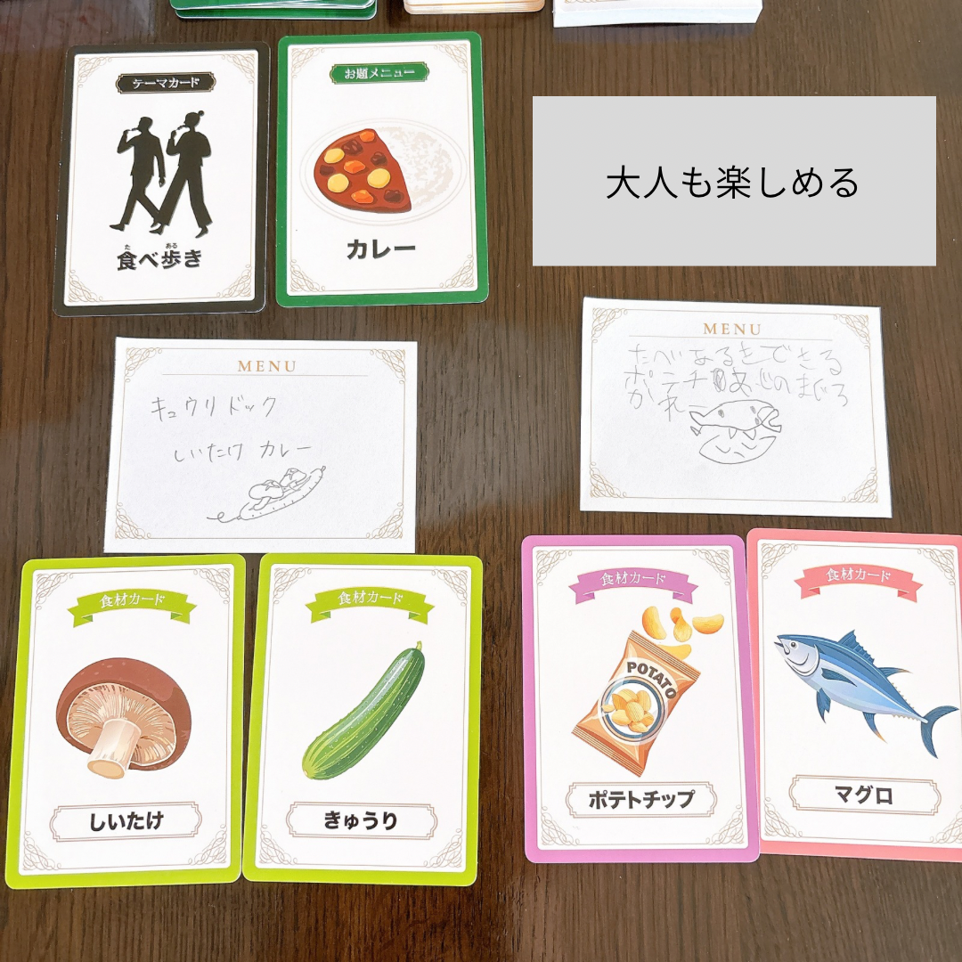 「食材カード」をひいて、お題やテーマに沿った料理を考えてプレゼンするゲームです。非常にシンプルなもの。9歳の息子はすぐにルールを理解し、楽しそうに真剣に考える様子が見られました。