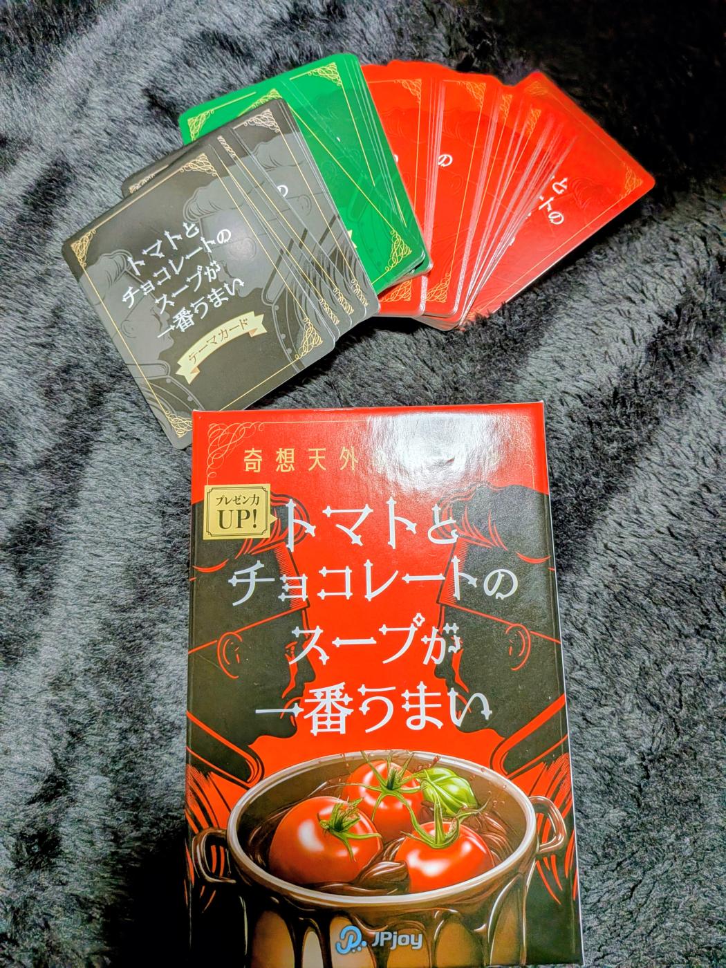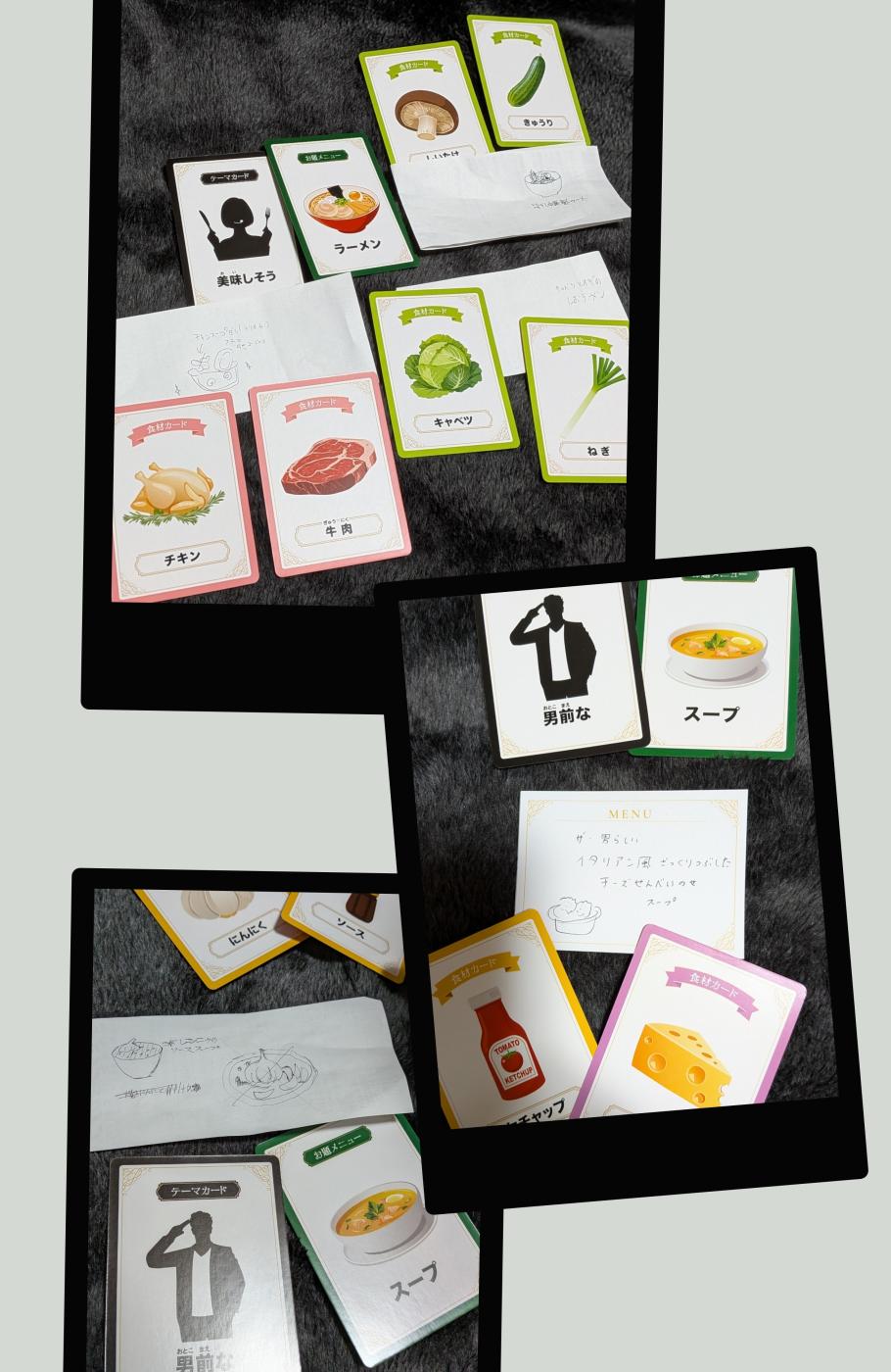 開封したらテーマに沿って、取得した自分用のカード2枚のアイテムを使いお料理を考えて工程も説明できるように考えてからプレゼンするというものでした。