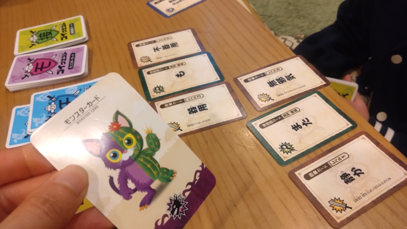 各プレイヤーは語彙カードと接続詞カード持ち、山札のモンスターカードとチャレンジカードをめくります。