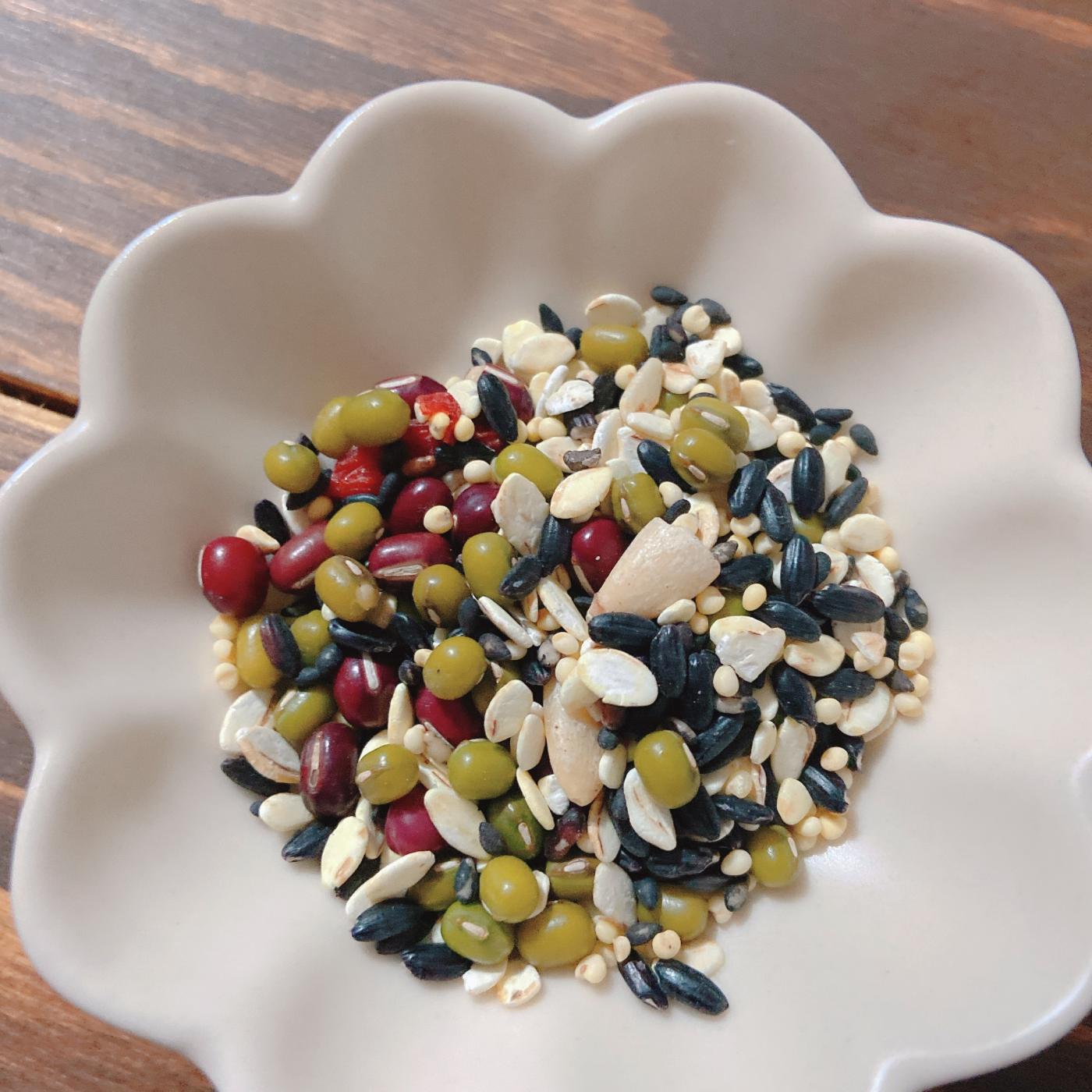 緑豆、小豆、クコの実、松の実、黒米、押し麦、もちきび、黒ごまと豊富?