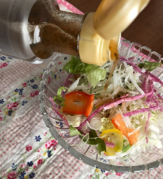 母も「香 りがよくて、おいしいね。酸味がちょうどいいから、普段のサラダがデリのサラダのようになるのね。」と言って、大絶賛していました。
