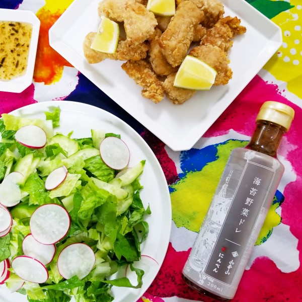 そして、唐揚げにはかけるのではなく、つけだれとして用意してみました。酸味があるドレッシングなので、唐揚げがさっぱり食べられます。唐揚げにはレモンの酸味が合うし、磯辺揚げがあるぐらいだから海苔も合うし、やっぱり唐揚げとは相性が良い!