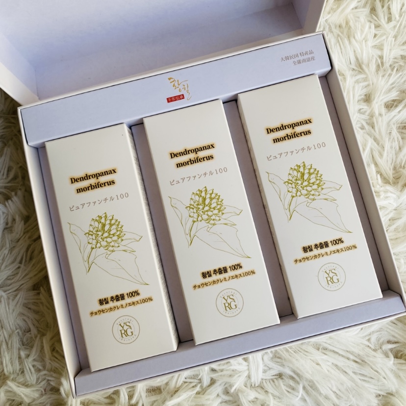 美容系のドリンクといえばプラセンタやビタミンなど思い浮かべますが、今回いただいたファンチルは、人参の木とも呼ばれる韓国の全羅南道地域と済州島のみで育つ常緑高木なんだそうです。高麗人参やシベリア人参・エゾウコギと同じウコギ科の植物で、ポリフェノール・エレウテロサイド・クロロゲン酸・ルチンが多く含まれる健康食品なんだそうです。