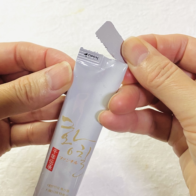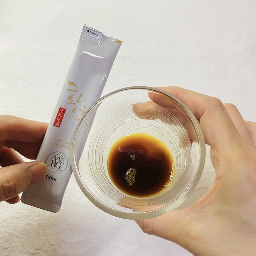 1日1包(15ml)を目安とし、そのままでも飲用できますが、実際のところ個人的にはかなり濃いのと、苦味も感じたので1スティックに対して100mlの水又はお湯で希釈した方が飲みやすいと感じました。