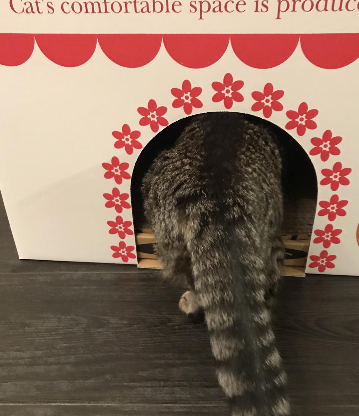 そこで今回は、大木紙業さん作による、段ボールで出来た「爪とぎハウス」の反応を見てみましたよ!