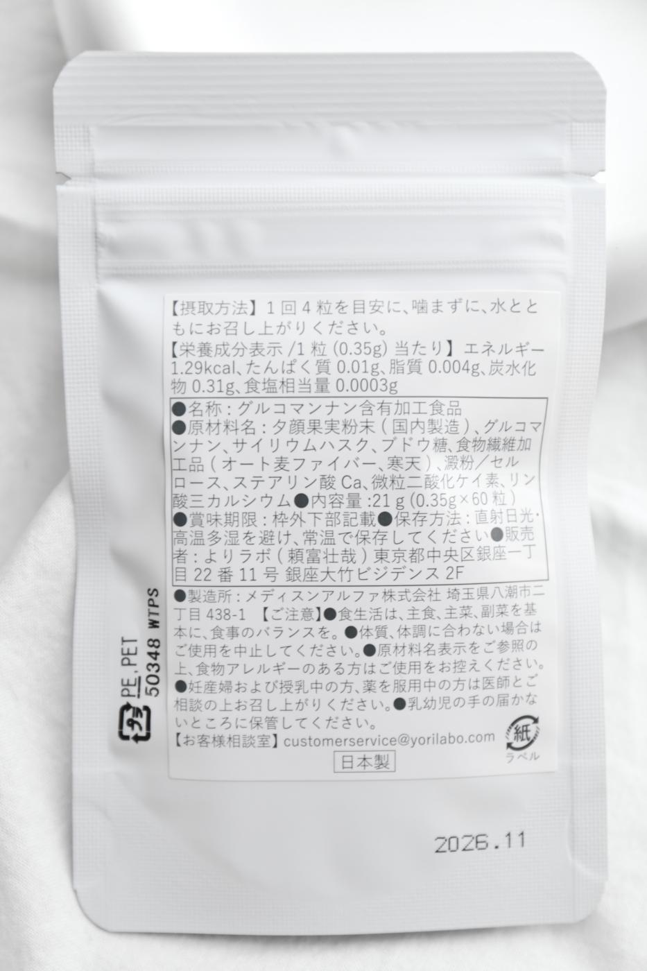 原材料に、夕顔果実粉末、グルコマンナン、サイリウムハスク等が配合されており、これらが水分に反応して膨張する働きがあるため、満腹感を得られるのだそう🌱