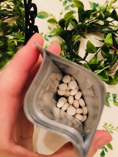 中にはグルコマンナン含有加工食品の白いラムネのような形状が入っています。