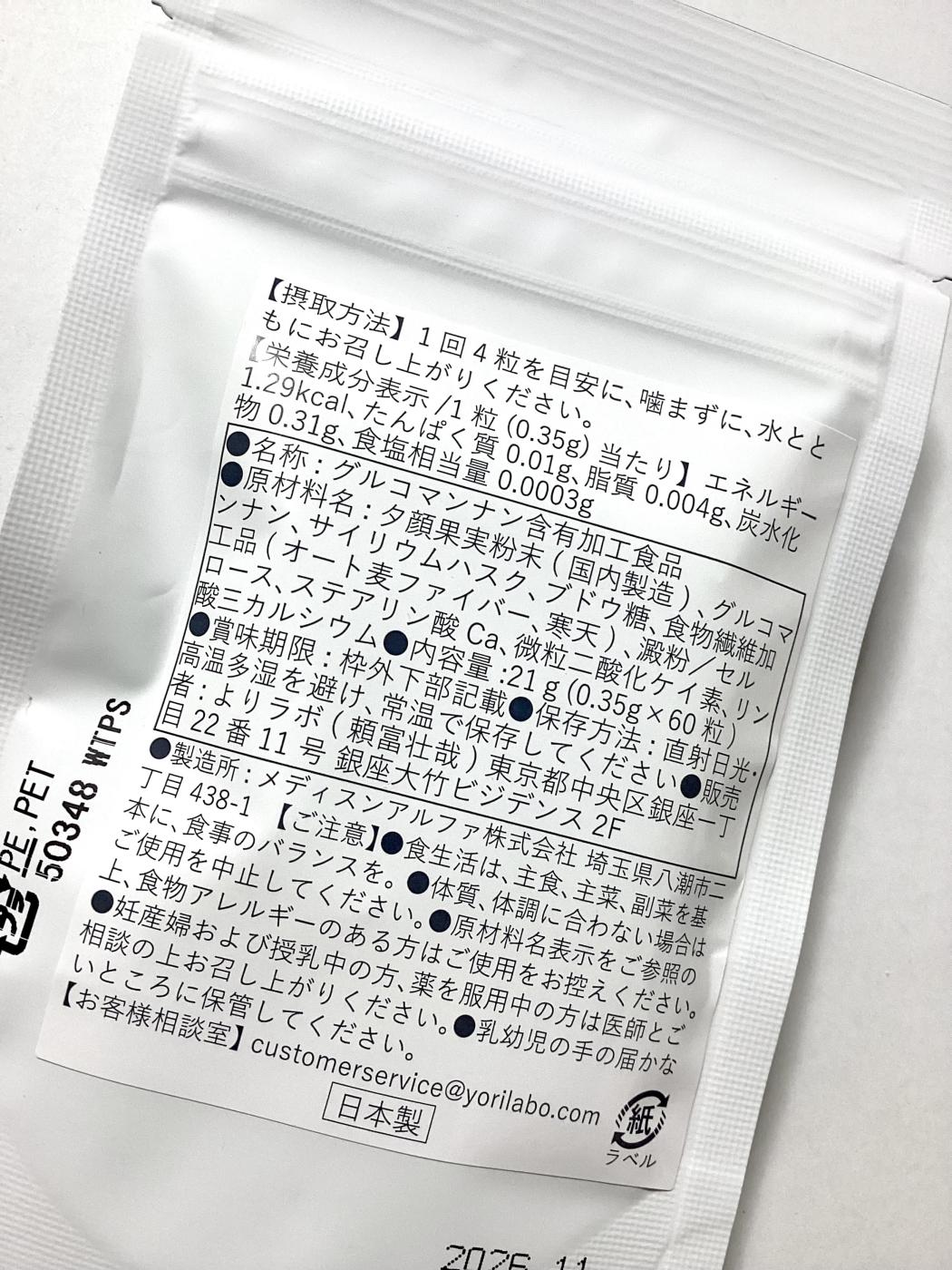 夕顔果実粉末、グルコマンナン、サイリウムハスク等が配合されていて、水分に反応して膨張することで満腹感を得られやすいんだそうです。