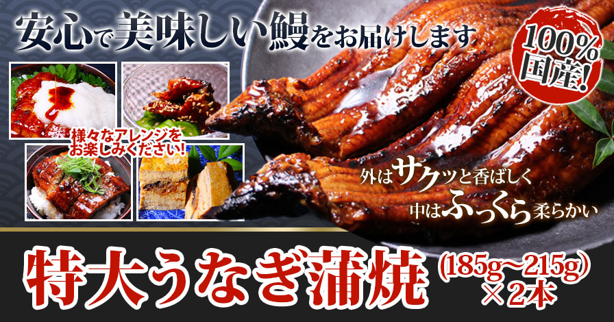 特大うなぎ蒲焼特大うなぎ蒲焼栄養たっぷりのうなぎを食べて体調をこわしやすい夏を乗り切ろう! 脂がのった国産のブランドうなぎをお届けします! 遠赤外線・近赤外線をバランスよく使用した電気ヒーターで芯からしっかりと焼き上げています。 業界初のこの電気ヒーターは、備長炭で焼くのと限りなく近い仕上がりに。 しっかりと焼き上げたうなぎの蒲焼は、 「皮はパリパリ香ばしく、身はふっくら」 絶品の味わいです。 さこばの朝一がオススメする薩摩川内のうなぎは、 特大サイズなので、1尾で2人前でも十分な大きさです! 内容量:(185g~215g)x2本5.00 / 18件のレビュー この商品の購入はコチラ