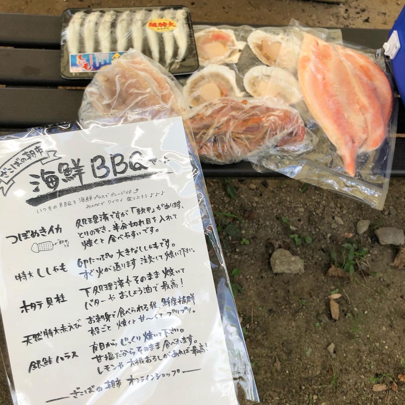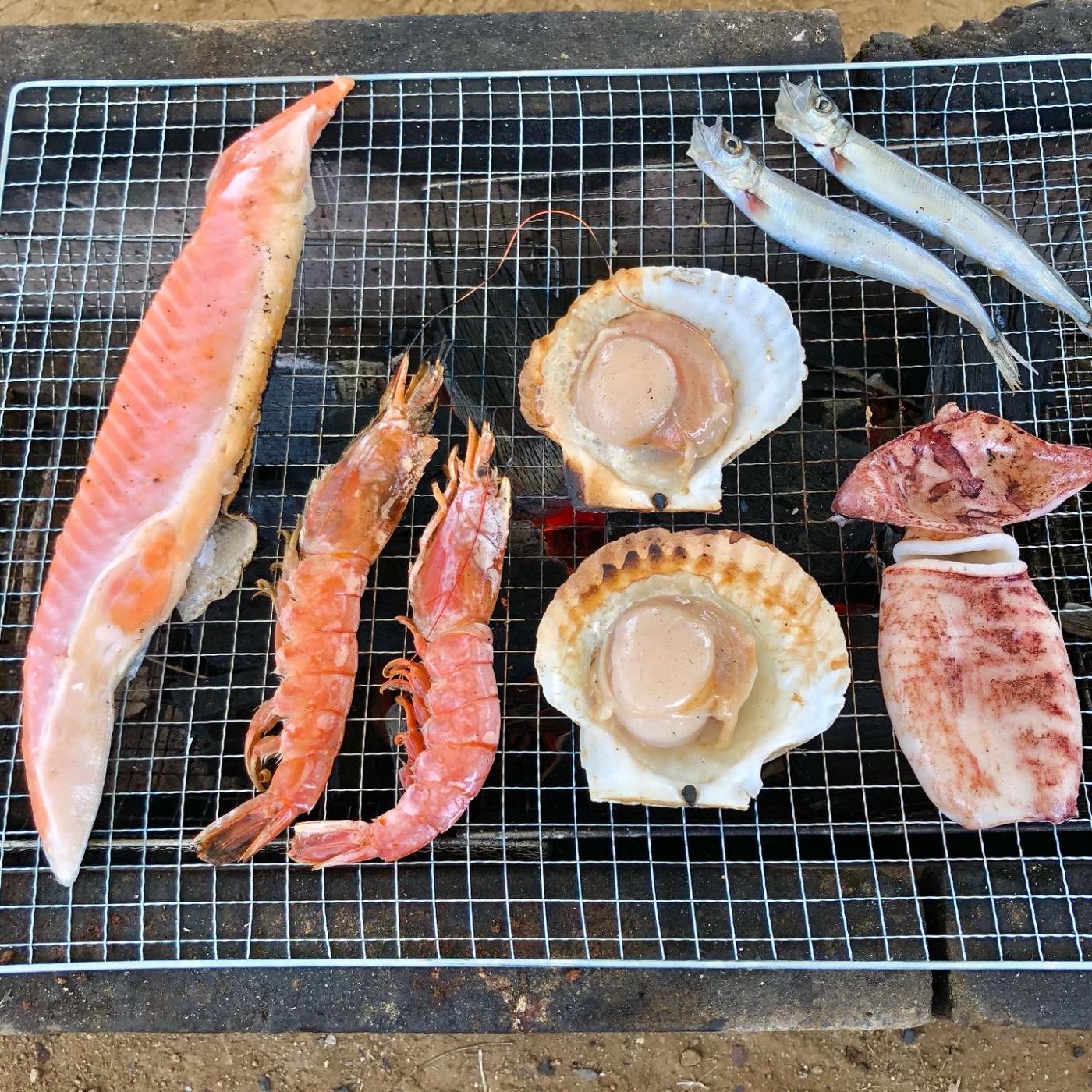 バーベキューセットの内容は・つぼぬきイカ・特大ししゃも・ホタテ貝柱・天然特大赤えび・銀鮭ハラスの豪華な5点セットです⭐︎特に美味しかったのが特大ししゃもとホタテ貝柱です♪