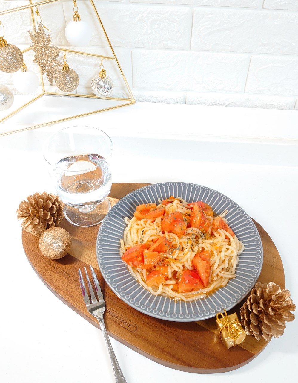 トマトパスタはトマトをにんにくオリーブオイルで炒め、コンソメで味付けました。
