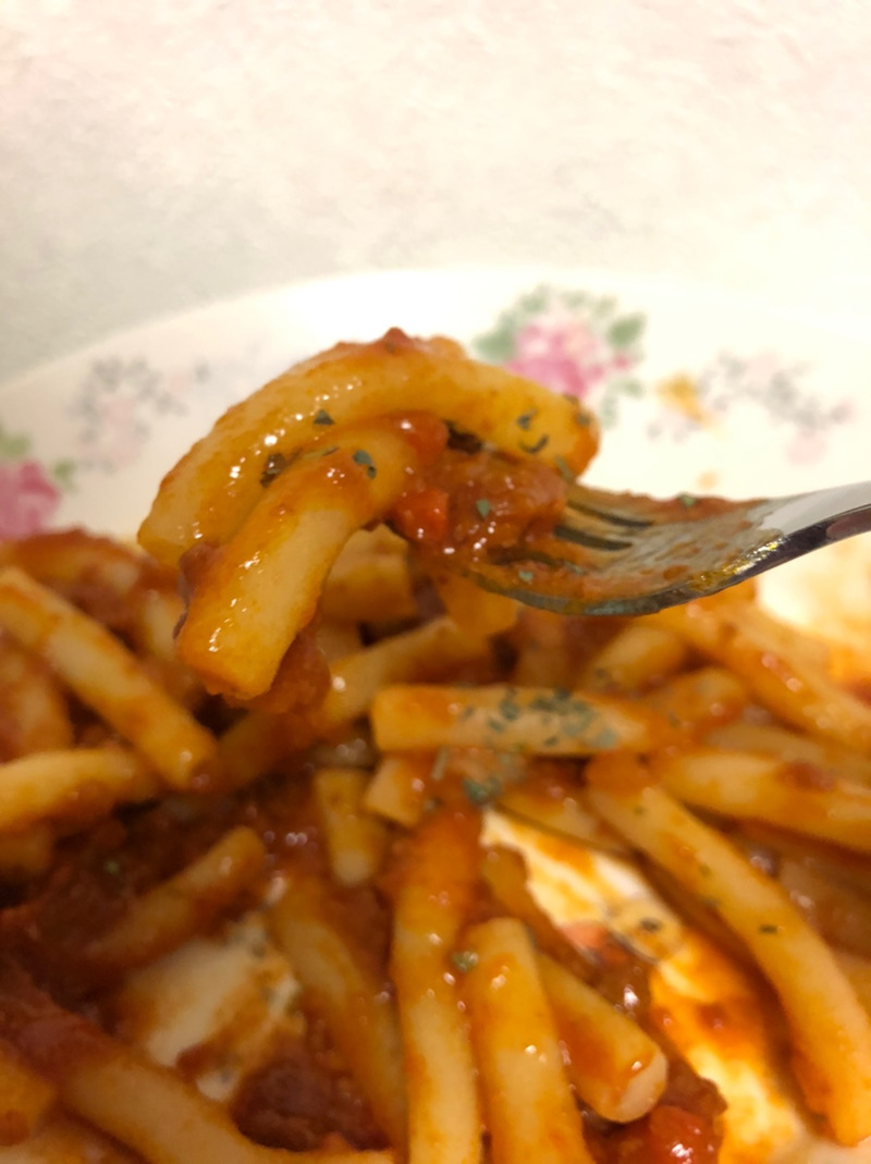 ミートソースと和えたのですが、いつも食べているパスタと変わらずにおいしかったです。