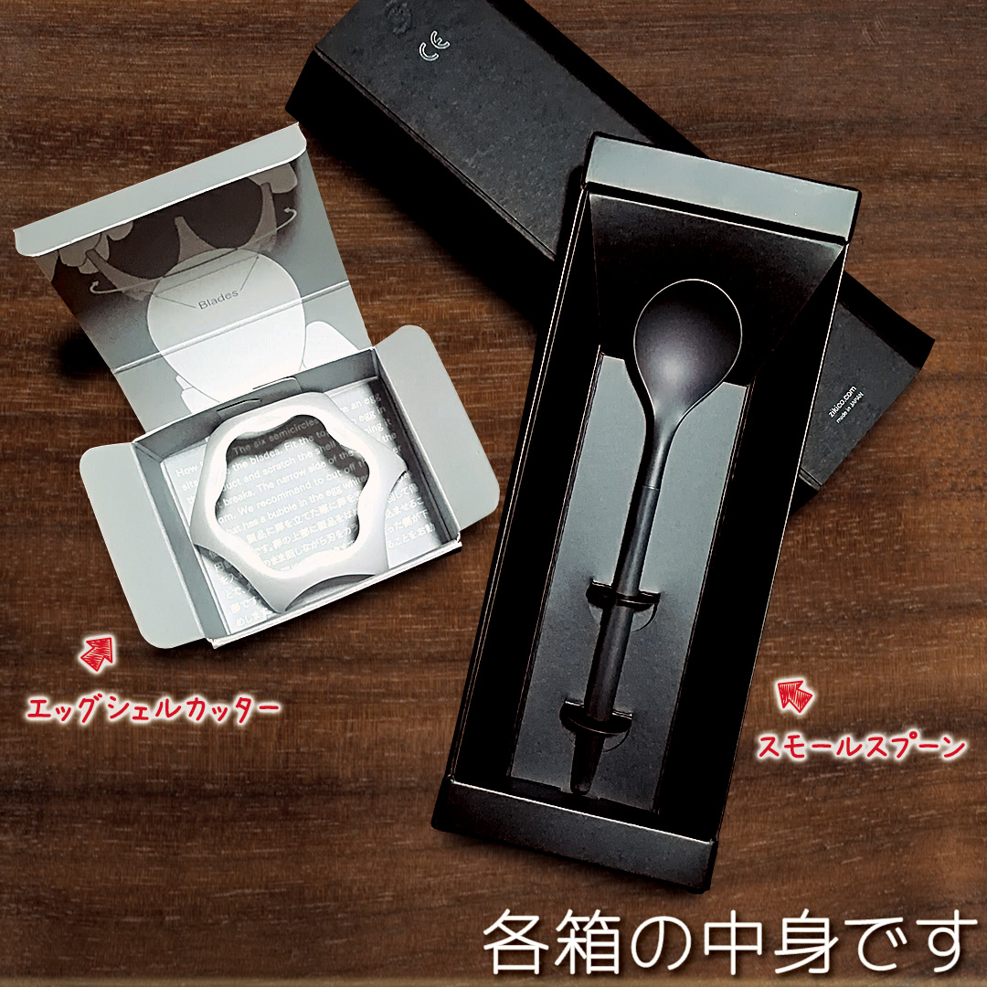 エッグシェルカッターとスモールスプーン、どちらもジルコニアをいう特殊な硬い素材が使われており、スモールスプーンは白タイプ(柄は黒、先端側が途中から白)と黒(全体が黒)の2パターンがあります。