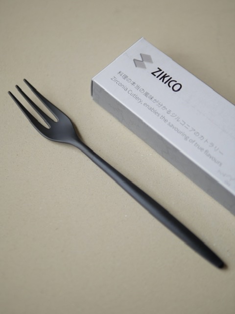 金属ではないジルコニアのカトラリーです。ジルコニアは金属イオンを放出しないので料理の本当の風味がわかるそうです。出汁の味見には陶磁器、ワイングラスはガラス、キャビア用のスプーンが貝殻からできているのは同様の理由からだそうです。