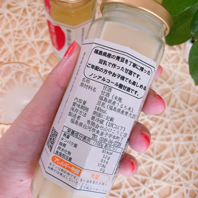 福島県産の青豆を丁寧に搾り豆乳で作られた甘酒ですが、豆乳の嫌な感じ(笑)も少なかったから飲みやすかった✨