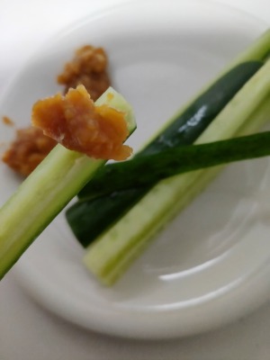 味が分かりやすいよう、きゅうりにつけて食べ比べてみたところ、関のみその方が粒が大きく甘みが強いように感じました。