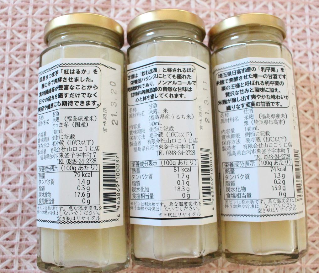 こうじ甘酒・さつま芋甘酒・くり甘酒セットをお試しさせていただきました。