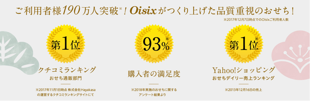 Oisix(オイシックス)は有機や低農薬野菜、無添加食品を取り扱っていて、利用者数500万人を突破した大手の食材宅配サービスですが、おせちの評価も高く、昨年購入者の満足度はなんと94.4%と毎年人気なんです!