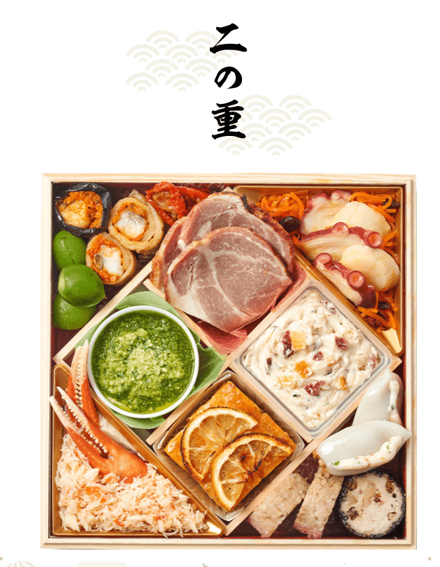 一の重には、定番の黒豆や栗きんとん、伊達巻などが入った和風の料理が13品。