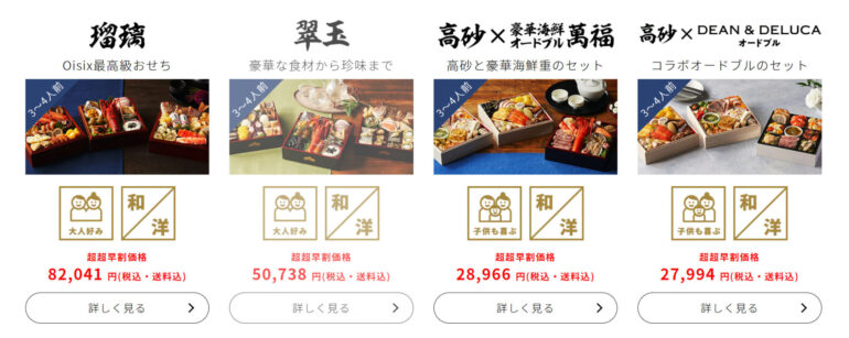 他にも、豪華海鮮が楽しめる「上慶梅」やオイシックス最高級おせち「絢宝」などがあります。