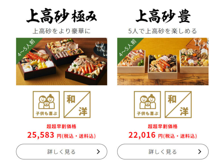 3段重で人気の「上高砂」がさらにボリュームアップした和洋折衷のおせちになっています。