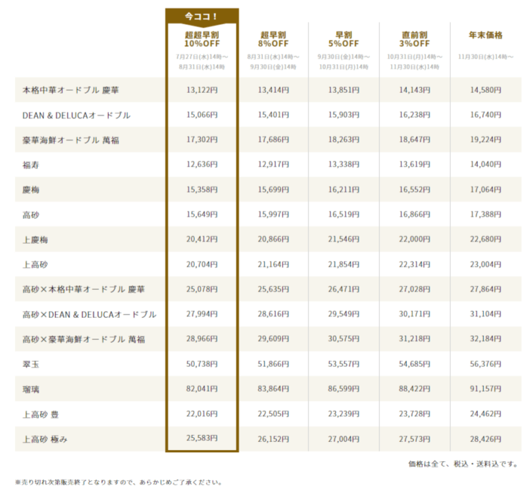 ただし、人気の商品は売り切れてしまっていたり、その年によって変わってきてしまうので確実にほしい!という方は「早割」で予約する方がいいですね。