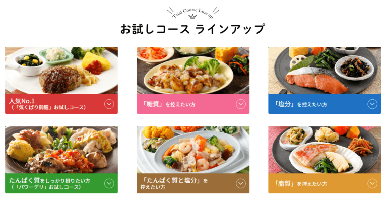 ニチレイフーズダイレクトでお試しできるのは、気配り御膳・ウーディッシュ・健康管理食(糖質・塩分・脂質・たんぱく質制限)の6種類からお好きなコースが選べます。