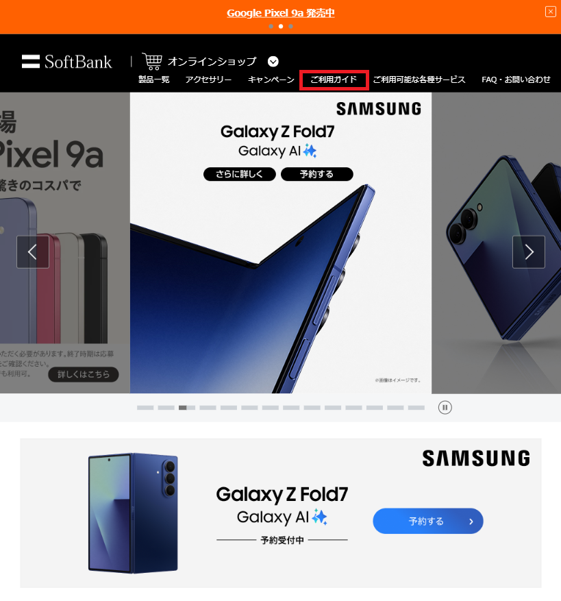 ①ソフトバンクオンラインショプの公式サイトから「ご利用ガイド」をタップ